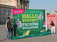 07.06.19 - Brandenburger Bündnisgrüne stellen ihre Plakatkampagne zur Landtagswahl vor – ab 1. Juli für alle an Laternen und auf Großflächen sichtbar. Zugleich erlebt der Landesverband eine neue Eintrittswelle. Wahlkampfauftakt der Bündnisgrünen in Potsdam: Vor dem Landtag auf dem Alten Markt präsentierte das Spitzenduo Ursula Nonnemacher und Benjamin Raschke zehn Plakatmotive für den Landtagswahlkampf. Ab 1. Juli werden die 10 Plakatmotive im Land sichtbar sein. „Hallo Zukunft. Tschüss Stilland“,…