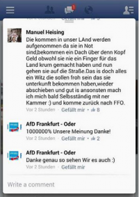 Wer der unmissverständlichen Inaussichtstellung von Gaskammern für Flüchtlinge nicht sofort und entschieden entgegentritt, sondern seine 1.000.000 fache Zustimmung erteilt - wie der Facebook-Eintrags erkennen lässt - hat den Boden der freiheitlich demokratischen Grundordnung verlassen. Später nachgeschobene wohlfeile Beteuerungen so etwas nicht mitzutragen, sind dann bedeutungslos. Bemerkenswert bleibt, dass die AfD dazu bisher trotz einiger Bürgeranfragen auf ihrer Internetseite keine Stellungnahme abgegeben hat.