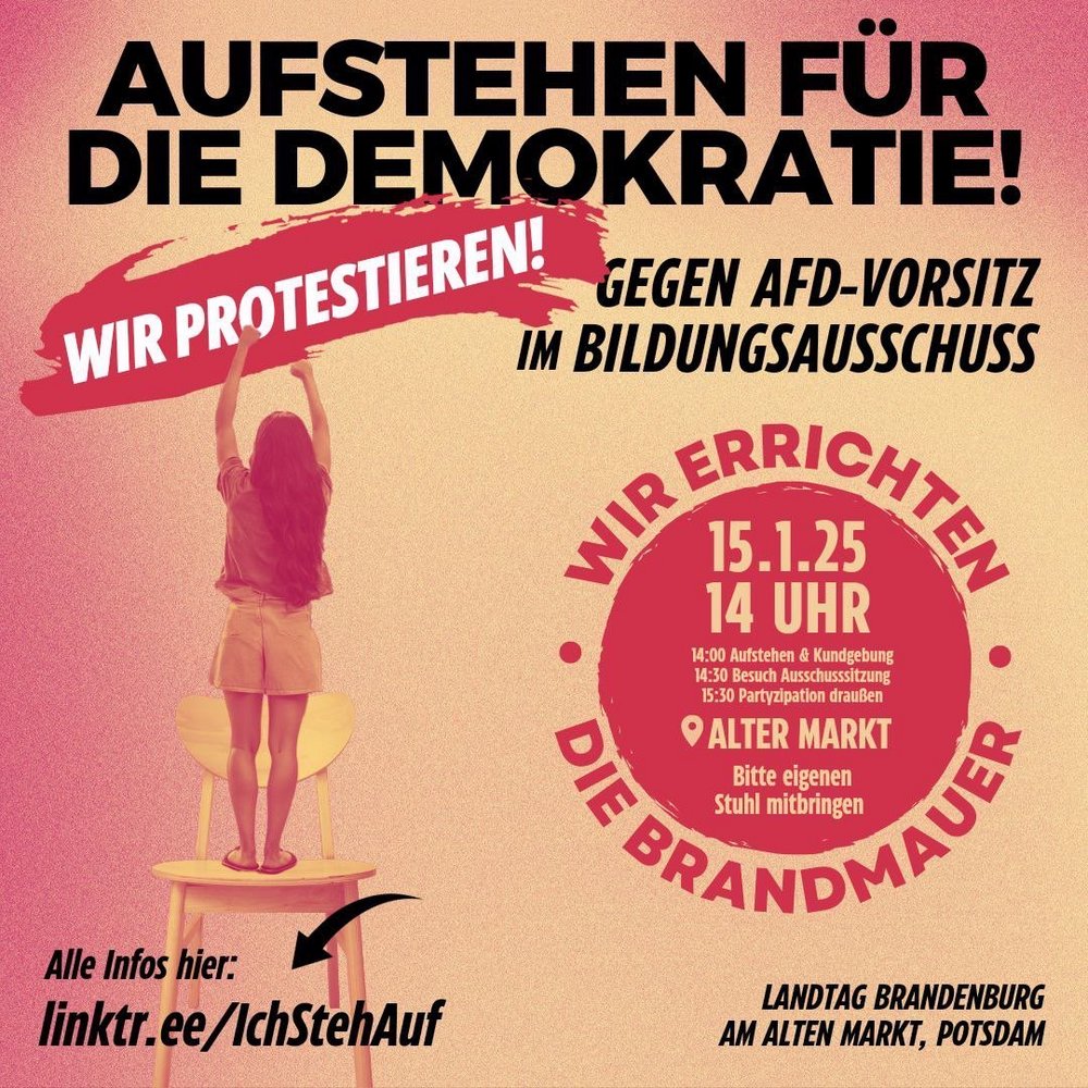 Die Bündnisgrünen rufen auch zur Teilnahme an der Protestdemonstration am kommenden Mittwoch, dem 15. Januar, um 14 Uhr am Alten Markt in Potsdam auf. „Wir Bündnisgrüne werden auch vor Ort sein, um gemeinsam mit Schülerinnen und Schülern, Pädagoginnen und Pädagogen sowie Vertreterinnen und Vertretern der Zivilgesellschaft ein klares Zeichen für Demokratie, Vielfalt und Toleranz zu setzen“, kündigt Alexandra Pichl an.