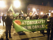 In Potsdam demonstrierten gestern gut 100 Menschen gegen den Castor. Mit strahlender Fracht an Bord zog der symbolische Castortransport durch die Potsdamer Innenstadt und lud die Fässer direkt vor dem Büro der CDU in der Friedrich-Ebert-Str. ab.
