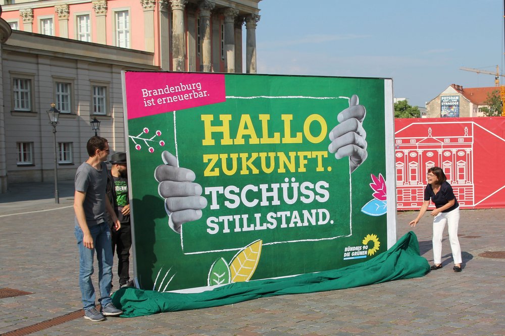 „Hallo Zukunft. Tschüss Stilland“, steht in großen Lettern auf der zunächst verhängten Großfläche, die Ursula Nonnemacher und Benjamin Raschke gemeinsam enthüllten. Ein magentafarbener Balken quer darüber verheißt „Brandenburg ist erneuerbar“. Benjamin Raschke greift den Claim der Werbekampagne auf: „Brandenburg ist erneuerbar, davon sind wir überzeugt und dafür kämpfen wir seit Jahren mit konstruktiver, sachlicher Politik aus der Opposition heraus. Wir wollen Brandenburg noch lebens- und liebenswerter machen. Wir stehen für mehr Tierwohl, für ökologische Landwirtschaft und gesundes Essen, für mehr Bus- und Bahn, für saubere Energien. Wir wollen eine gute medizinische Versorgung und bessere Pflege nah am Wohnort. Wir wollen mehr Hebammen, Erzieher*innen und Lehrkräfte ausbilden und die Zukunft unserer Kinder sichern.“