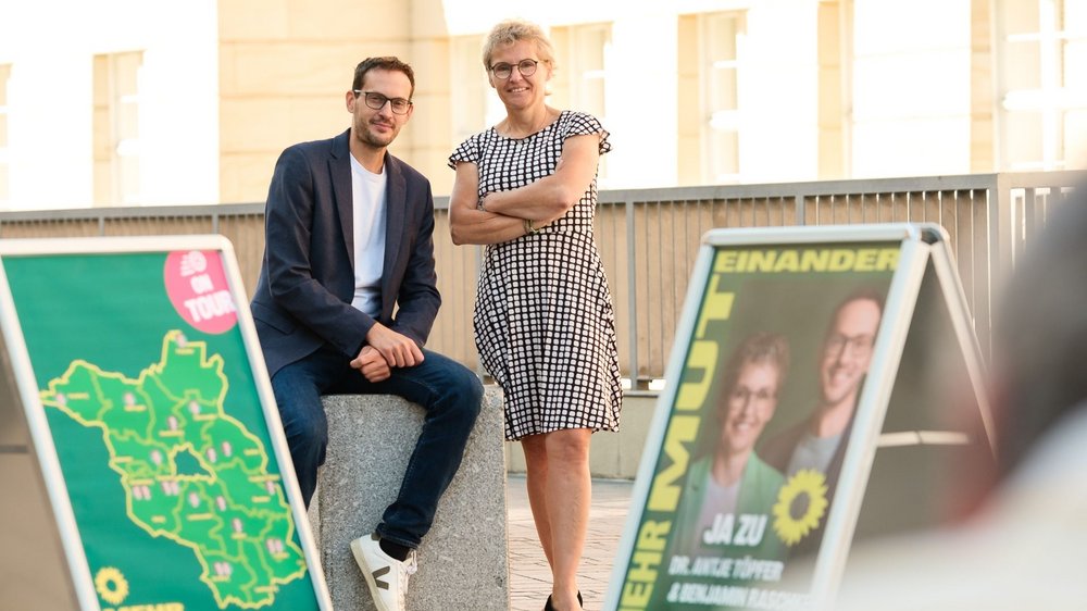 Die Spitzenkandidierenden Dr. Antje Töpfer und Benjamin Raschke haben am Dienstag vor dem Brandenburger Landtag die heiße Phase des Wahlkampfes mit ihrer landesweiten „Mehr MUTeinander“-Tour gestartet. Knapp vier Wochen vor der Landtagswahl am 22. September 2024 werden die beiden Spitzenkandidierenden in allen Regionen Brandenburgs unterwegs sein, um mit den Menschen vor Ort ins Gespräch zu kommen. Dabei werben die Bündnisgrünen für ihre Lösungen in den Bereichen bezahlbarer Wohnraum, bessere Mobilität, Erhalt von Gesundheitsstandorten und vor allem Klimaschutz.
