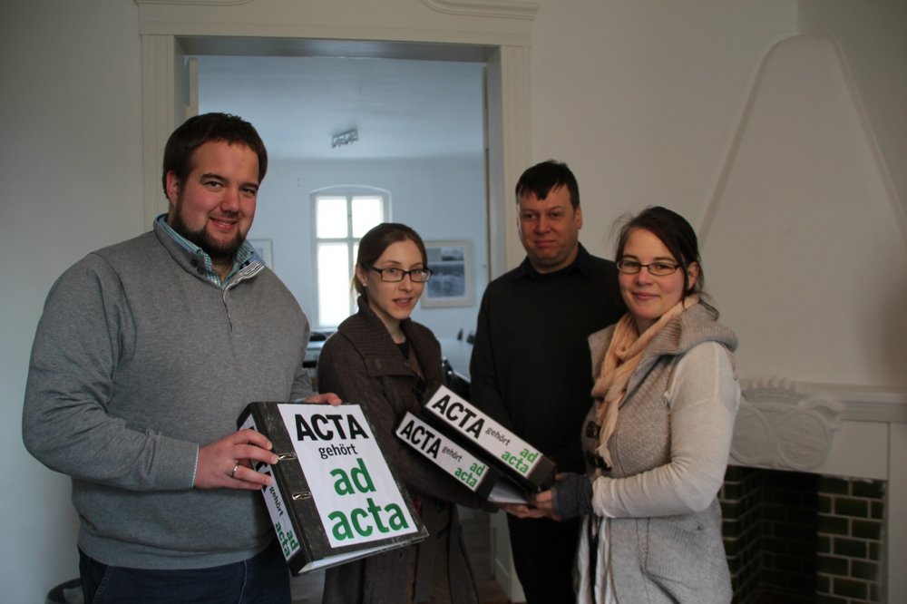 Anlässlich des Safer Internet Days, dem von der Europäischen Kommission ausgerufenen Tag der Sicherheit im Netz, am heutigen Dienstag, 07. Februar, übergaben die Brandenburger Bündnisgrünen gemeinsam mit Malte Spitz, Mitglied des Bundesvorstands von Bündnis 90/Die Grünen, symbolisch einen Aktenordner mit dem Urheberrechtsabkommen ACTA* an das Büro des CDU-Europaabgeordneten Dr. Christian Ehler . Damit fordern die Bündnisgrünen – entschiedene Gegner des ACTA-Abkommens im Europäischen Parlament – den CDU-Europaabgeordneten dazu auf, sich auch in seiner Fraktion dafür stark zu machen, ACTA abzulehnen.