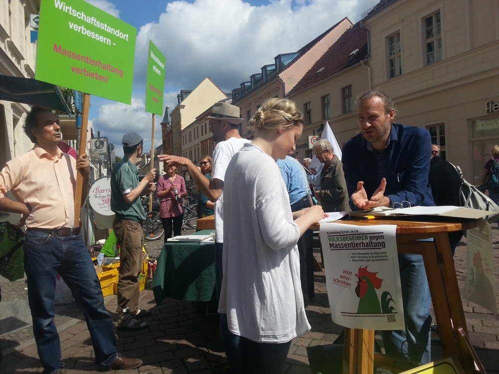 In ganz Brandenburg diskutieren Menschen darüber, welche Art von Landwirtschaft zukünftig betrieben werden soll. Dabei geht es neben dem Tierschutz auch um den hohen Antibiotika-Einsatz, die Belastung von Wasser und Boden durch Unmengen an Gülle sowie die Auswirkungen unserer Landwirtschaft auf Entwicklungsländer. Die industrielle Landwirtschaft verliert an Akzeptanz in der Bevölkerung. Selbst der Landwirtschaftsminister musste schon Zugeständnisse machen. Er will nun ab 2017 die Basisförderung für Tierhalter streichen.