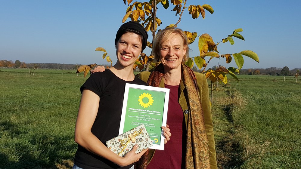 Eine Junglandwirtin mit ihrem Walnusshain auf den Veltener Luchwiesen ist die neue Grüne Gründerin: Heute Vormittag hat die Brandenburger Landesvorsitzende von BÜNDNIS 90/DIE GRÜNEN PETRA BUDKE die 29-jährige Vivian Böllersen ausgezeichnet. Im März 2015 hatte sie ihre Firma „Land- und Gartenwirtschaft Böllersen“ gegründet.
